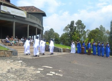 Located in Buvungira Cell of Bushekeri Sector of Nyamasheke district of the Western Province of Rwanda, Nyungwe Top View Hill Hotel is owned by a Rwandese entrepreneur and conservationist.In operation since February 2011, the hotel is composed of two distinct compartments. The main area consists of a large, two-tiered rondavel (see photo below) with a phenomenally high roof. Although a rondavel is usually a traditionally built round house, this building offers a rather more modern take on the theme. The ground floor, where you find the reception, is furnished with a few modern angular sofas and walls adorned with traditional Rwandan murals.Circular wicker lights hang from the ceiling and dark tiled stairs lead you up to a mezzanine balcony. Whereas the basement cubicle hosts administration offices, the reception, kitchen, store and the laundry, it is the second level that hosts dining area and the bar both with tables and chairs set on a rather out-of-place black-tiled floor and a sweeping veranda with all-weather tables and chairs of steel and moulded materials. The views from here are stunning and on clear days you can even see Lake Kivu and the volcanoes of far North Rwanda and the Eastern of Democratic Republic of Congo. The bar on this level is entirely decorated from bottle tops, giving it a bright but simple look.