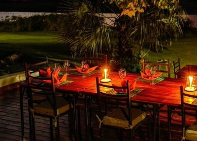 The accommodation area is connected to the main camp via raised wooden walkways crossing the wetlands and magically lit by fairy-like lanterns. All our guests can enjoy the elevated bar, lounge and dining room, our campfire boma and the sparkling pool.
