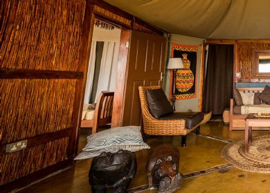 In a prime location, the lodge is set on the edge of a pristine waterhole that regularly attracts a wide variety of wildlife, including a family of elephants that often frequent the area. Within the reserve boundaries, the lodge is completely unfenced to give guests a unique experience in the natural surroundings. There are six tented chalets available – four twins, and two doubles – that look out onto the waterhole. The common areas consist of a central dining and restaurant lapa as well as a birding platform.